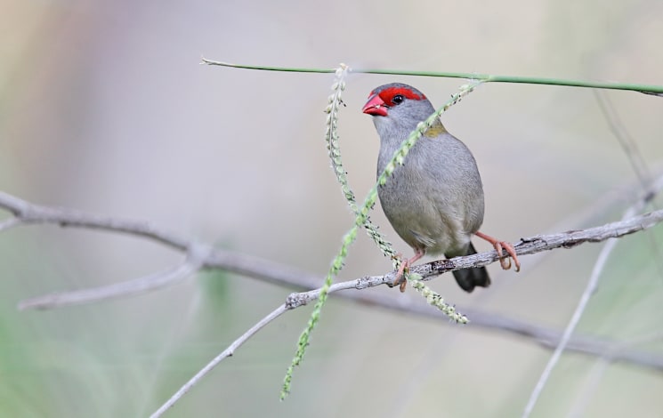 The red-browed finch is most easily recognised by its bright red eyebrow, rump and beak, on an otherwise green and grey bird.